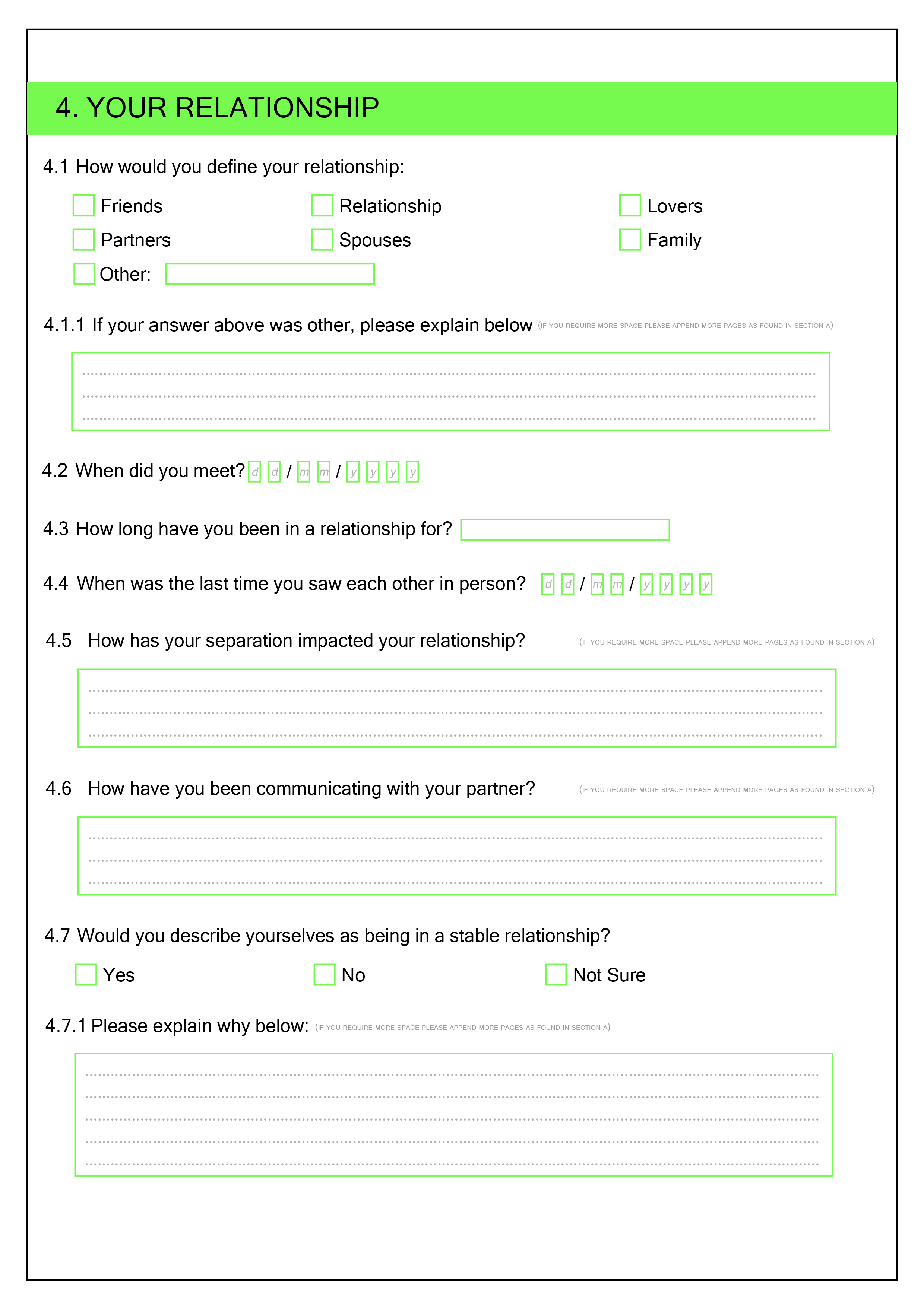 This is an alternative visa application form, one that leaves room for the expression of a personal story and yet, given its limited nature, remains frivolous in its attempt to describe something as subjective as love.